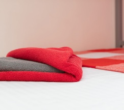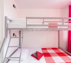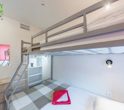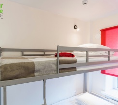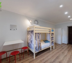 В комнате располагается: двухъярусная семейная кровать с ортопедическими матрасами (ширина нижнего спального места 130 см., верхнего 90 см), небольшой письменный стол с 2 табуретами, стеллаж для хранения вещей, комод и зеркало, удобная напольная вешалка. Комплект гигиенических принадлежностей и тапочки входят в стоимость проживания. Смена белья и полотенец каждые 3 дня.