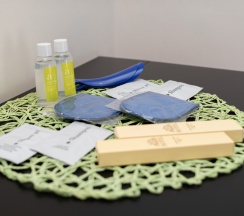 В гостиной зоне располагается диван и журнальным стол. Гигиенические принадлежности и тапочки входят в стоимость проживания. Вид из окна на город.