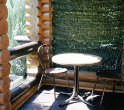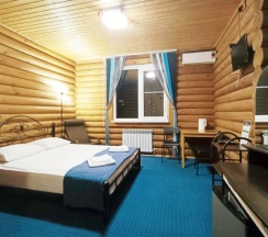 Атмосферный номер из сруба сибирской сосны с большой двуспальной кроватью. На первом этаже с собственной верандой, где можно уединенно позавтракать или поужинать. В номере есть телевизор, холодильник, сплит система, чайник, обеденный стол, трюмо, платяной шкаф. Большая площадь номера позволяет поставить дополнительное место без стеснения для проживания.