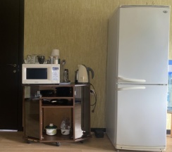 На этаже также имеются: холодильник, чайник, микроволновая печь, посуда.