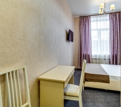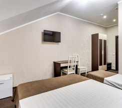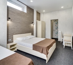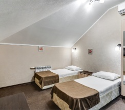 Стандартный номер Твин с двумя раздельными односпальными кроватями и собственной ванной комнатой с душем, туалетом и раковиной. В номере сплит-система, ЖК телевизор, холодильник, письменный стол, шкаф, стулья, вешалка. Площадь составляет 18 кв.м. Гостям бесплатно предоставляются одноразовые банные принадлежности и тапочки.