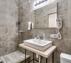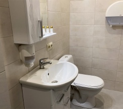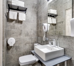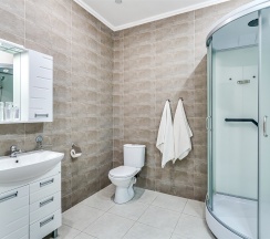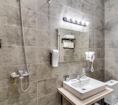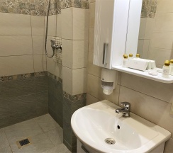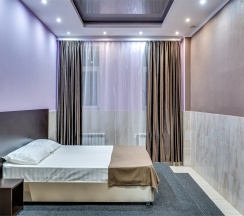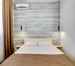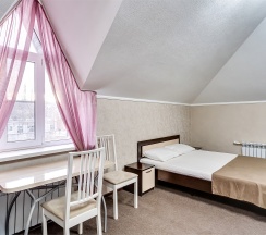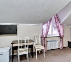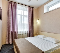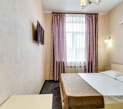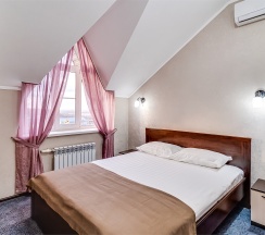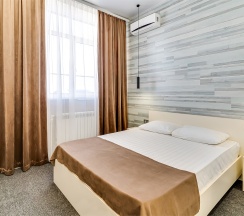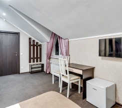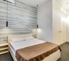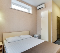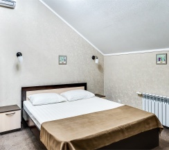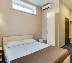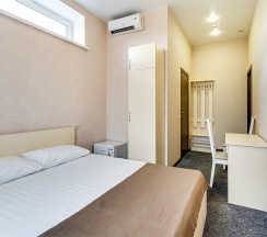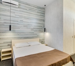 Улучшенный стандартный номер с большой двуспальной кроватью и собственной ванной комнатой с душем, туалетом и раковиной. В номере сплит-система, ЖК телевизор, холодильник, письменный стол, шкаф, стулья, вешалка. Площадь составляет 20 кв.м. Гостям бесплатно предоставляются одноразовые банные принадлежности и тапочки.
