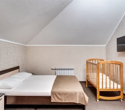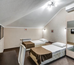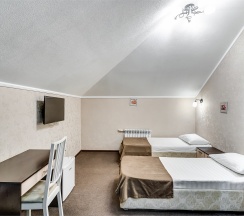 В номере большая двуспальная кровать и одна односпальная, ЖК телевизор, шкаф, вешалка для одежды, сплит-система, стол, холодильник. Собственная ванная комната с душем, туалетом и раковиной. Гостям остановившимся на сутки и более бесплатно предоставляются одноразовые банные принадлежности и тапочки.