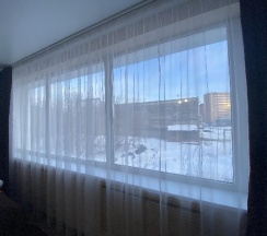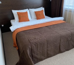 Номер хороший, чисто, симпатично, со своим санузлом, большая кровать, есть чайник, холодильник, телевизор, кондиционер и окно открывается, шторы блэкаут. Но вот завтрак не понравился: омлет пережарен, не смогла есть, 2 тонких кусочка помидора к нему, каша пшеничная, маленькая порция, 2 блина со сгущенкой, кофе чёрный невкусный. Еще странно, что были даже халаты, но не было тапочек. В целом очень достойно. Минус звезда за завтрак и тапочки.