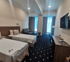 Хорошая гостинница, расположена в шаговой доступности от Каспийского моря, занимает 2 этажа здания. Заселились в просторный номер с огромным окном выходящим на основную часть города и в том числе на оживленную дорогу. Для тех, кто чутко спит, да и для всех других, - не самый лучший вариант, так как хорошенько выспаться не получится из-за постоянно ревущих под окнами машин. Шумоизоляция ни какая! Номерной фонд в порядке, мебель не «уставшая», есть кофе машина, бутилированная вода как в номере, так и в коридоре. Завтрак вполне приемлем. Рядом с гостиницей много различных сувенирных магазинов и кафе.