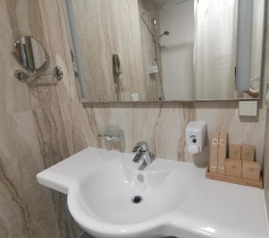 Прекрасный отель, всё понравилось. И месторасположение, и уровень сервиса, и персонал, и отличные завтраки, и укомплектованность номера всем необходимым. Номер просторный, потолки высокие. В ванной комнате фен, халаты, тапочки, полотенца, отельные гель/шампунь/мыло/бритвенный и зубочистный наборы/шапочка для душа/ватные диски и палочки. В прихожей собственная гладильная доска с утюгом. Кофемашина и эл.чайник с принадлежностями для кофе/чая. Тарелки, чашки, стол.приборы. Минибар-холодильник. Есть даже швейный набор. Каждый день ставят воду на каждого. Кровать очень удобная, белье белоснежное. Очень достойный современный отель.