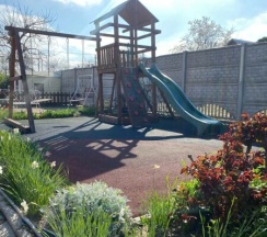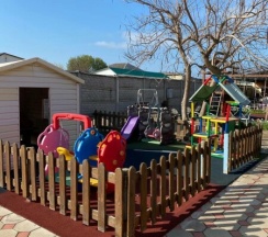 На территории есть небольшая детская площадка(домик, маленькая горочка и качели) для совсем маленьких гостей. Но детская площадка у нас не одна! Для детей от 5 до 10 лет есть детский городок с качелями, горкой и минискалодромом. Дети постарше, часто собираются под навесом и играют в настольные игры, обогащая своё мировоззрение общением друг с другом, рассказывая о городах, в которых живут и о себе.