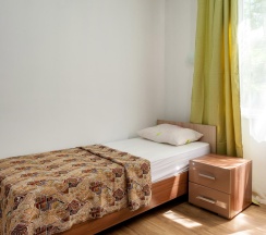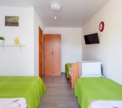 Комната 15 м. кв. рассчитана на проживание до 4 человек, в комнате расположены большая двуспальная кровать с прикроватными тумбочками, размер спального места 1600*2000, двухъярусная кровать, размер спальных мест 800*1900, шкаф, ТV, косметический столик с зеркалом, сплит-система и индивидуальный санузел.