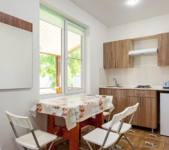 В каждой комнате свой санузел с душевой кабиной 2,5 кв.м., горячее и холодное водоснабжение постоянное, с хорошим и равномерным давлением , телевизор, сплит-система, холодильник, шкаф для одежды. Комната рассчитана на проживание 3-4 человек. В комнате 1 двуспальная кровать (1400*2000) и 2 односпальные кровати (800*2000). К комнате пристроена кухня-веранда площадью 6,3 кв.м., на которой есть мойка с горячей и холодной водой, плита, стол со стульями, индивидуальная посуда.