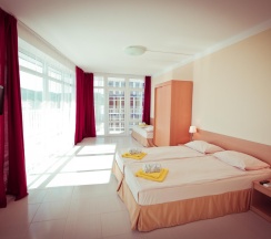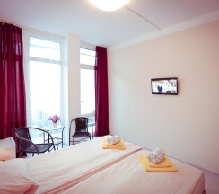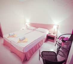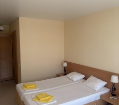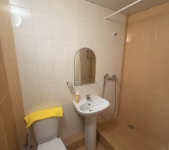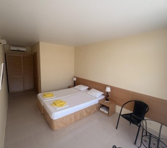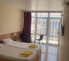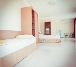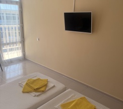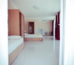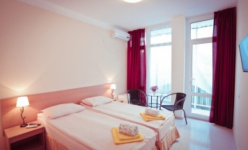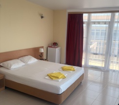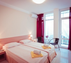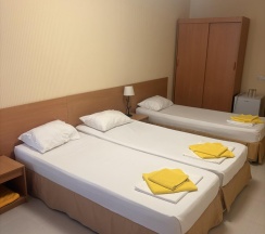 Бюджетная 2-х местная комната – прекрасный выбор для тех, кто выбирает комфортный отдых на море, но не любит переплачивать. Комната без вида из окна. Если вы хотите проводить все время на пляже, то эта комната для вас. В каждой комнате категории эконом вы найдёте, две раздельные кровати, которые при желании можно сдвинуть. Возможности поставить дополнительную кровать для ребенка нет. Комнаты этой категории включают в себя все удобства для проживания: туалет и душ, стол и два стула, мыло, полотенца, постельное бельё. В комнате телевизор, сплит-система, холодильник. Все комнаты объединены общим балконом, с которого гости заходят в комнату.