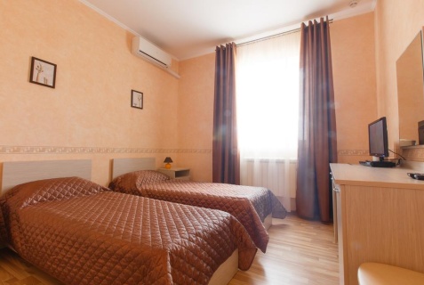В номере установлены: две кровати, две прикроватные тумбочки, два ночных светильника, кондиционер, телевизор, встроенный холодильник, стул, туалетный столик с зеркалом, шкаф для одежды, санузел и душевая, фен.