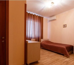 В номере установлены: односпальная кровать, две прикроватные тумбочки, два ночных светильника, кондиционер,телевизор, встроенный холодильник, стул, туалетный столик с зеркалом, шкаф для одежды, санузел и душевая, фен.
