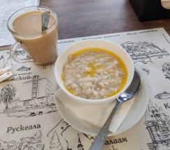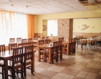 На входе с улицы довольно высокое крыльцо. За наружной дверью очень просторный холл с недавним ремонтом. Есть несколько кожаных диванов у стойки регистрации. Хорошо что кафе/ресторан находится в отдельном корпусе от жилых номеров - корпоратива не было слышно на 2 этаже. В номере есть электрочайник, телевизор. Несколько необычно в санузле номера душ без отдельного поддона, а трап в противоположной от душа стороне. А вот из минусов стоит отметить ощутимую слышимость то ли из коридора, то ли из номеров на смежных этажах. Для ночлега вполне подходит. Шведский стол отсутствовал - блюда приносят горячие сразу на стол из кухни. Заказывали на всю группу завтраки и ужины - без изысков, вкусно, питательно.