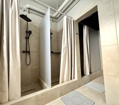 Нижний этаж, 3 односпальные кровати, телевизор, холодильник, эл.чайник в комнате; туалет, душ общие на этаже
