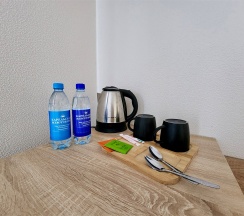 Уютный отель, проводят косметический ремонт. Заселили на 1 этаже, немного спуститься вниз, но по факту вид из окна на озеро как на втором этаже. Чисто, удобные кровати и подушки, все принадлежности есть:полотенца, гель, шампунь,фен, чай,кофе, чайник, вода. В номере в зимний период обогреватель, но хватало батареи