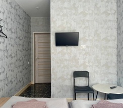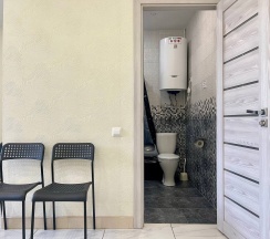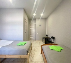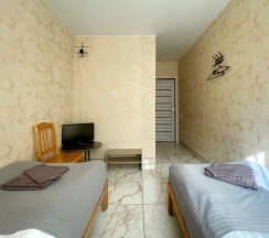 В нашем гостевом доме два таких номера. В каждом номере смогут разместиться до 2х человек, на двух односпальных кроватях. По вашей просьбе, мы можем сдвинуть кровати в двуспальную. На этаже расположены три санузла, три душевых, кухня где вы можете приготовить еду, столовая, стиральная машина, большая терраса.