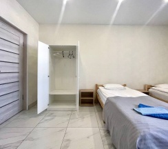 В нашем гостевом доме два таких номера. В каждом номере смогут разместиться до 4х человек, на четырех односпальных кроватях. По вашей просьбе, мы можем сдвинуть кровати в двуспальные. На этаже расположены три санузла, три душевых, кухня где вы можете приготовить еду, столовая, стиральная машина, большая терраса.