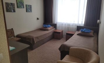 Двухместный номер повышенной комфортности с двумя раздельными односпальными кроватями. Удобства находятся в номере. В номере есть телевизор, Wi-Fi. По запросу предоставляются фен, утюг, фумигатор, вентилятор, столовые принадлежности.