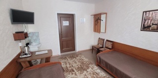 Трёхместный номер категории эконом с тремя раздельными односпальными кроватями. Удобства находятся на этаже. В номере есть телевизор, Wi-Fi. По запросу предоставляются фен, утюг, фумигатор, вентилятор, столовые принадлежности.