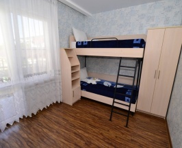 МЕБЕЛЬ — двухъярусная кровать-диван и двуспальная кровать (шир 160см) с ортопедическими матрасами, шкаф, тумба прикроватная, туалетный столик, пуф, вешалка;