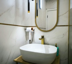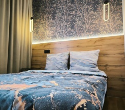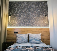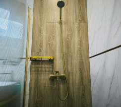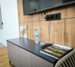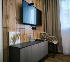 Номер оформлен в современном стиле. В нём есть всё необходимое для комфортного проживания: смарт-телевизор, душ.
