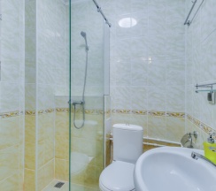 Стандартный двухместный номер с большой кроватью 13м2. Номер расположен на мансардном этаже. Оснащен большой двуспальной кроватью с ортопедическим матрасом, обеденным столом и рабочей зоной. Так же в номере есть большой телевизор, шкаф для хранения одежды, сейф, чайник и чайная посуда, холодильник, принадлежности для ухода за обувью и одеждой. Ванная комната с душем в номере, в которой так же есть все необходимое, большое зеркало, бесплатные косметические средства, фен и комплекты полотенец для каждого гостя.