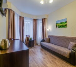 Номер категории Люкс предназначен для проживания до 3-х гостей и отличается от других типов номеров наличием второй комнаты. Вид из окна – город и великолепие гор.