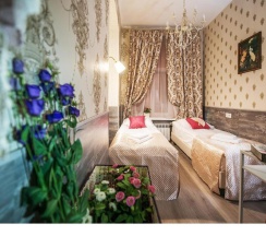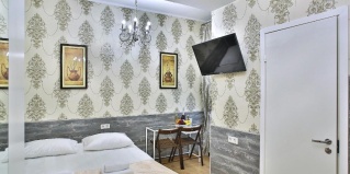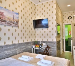 Комната оформлена в современном стиле с дизайнерскими элементами в отделке. В комнате имеется собственная душевая и санузел, современный ЖК телевизор, журнальный столик, стул, вешалка для одежды и полка для обуви. Особенностью данной комнаты является, то что очень редко встретишь окна выходят в парадную.