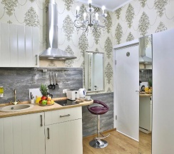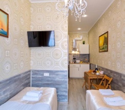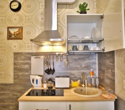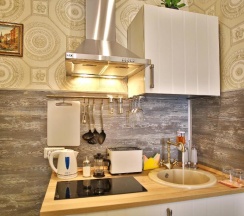Останавливалась в отеле в начале декабря в номере с мини-кухней. В состав мини-кухни входят чайник, плитка, посуда, раковина. Остальное находится в общей зоне: гладильная доска, холодильник, микроволновка, плита, посудомоечная машина, тэн, чай/кофе/сахар и пр. Я приходила только переночевать, поэтому пользовалась минимумом. Меня всё полностью устраивало. Доброжелательные и милые девушки всегда помогали. Выбрала данный мини-отель из-за близости к месту командирования и благодаря отзывам, но также успела пешком посетить многие достопримечательности: в радиусе ходьбы 30-35 минут обойдете очень многое. Я пользовалась метро пару раз, чтобы уехать на Васильевский остров. Дополнительная причина выбора данного отеля -постоянное присутствие сотрудника. Приятным моментом стало раннее заселение при наличии такой возможности (примерно в 10 утра), за что очень благодарна.