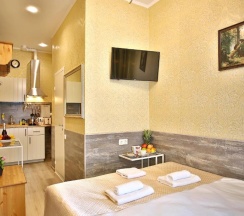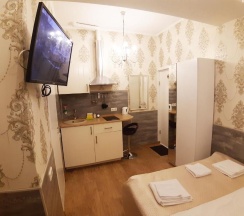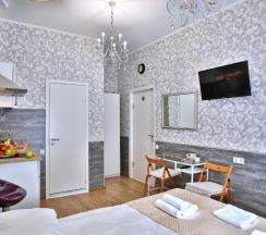 Комната оформлена в современном стиле с дизайнерскими элементами в отделке. Есть собственная душевая и санузел, современный ЖК телевизор, стол, стул, шкаф для одежды и обуви.Для гостей есть небольшая кухня с мойкой, варочной панелью, вытяжкой,электрическим чайником, тостером, кухонной утварью и необходимой посудой. Всегда чистое и свежее постельное белье и банные принадлежности.