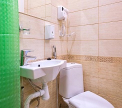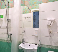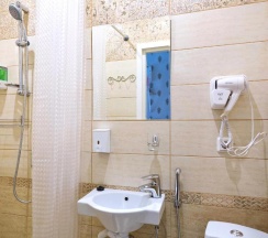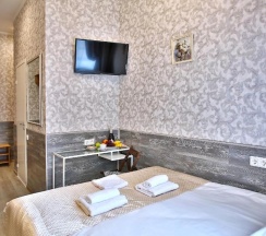 Комната оформлен в современном стиле с дизайнерскими элементами в отделке. В комнате собственная душевая и санузел, современный ЖК телевизор, стол, стул, шкаф для одежды и обуви. Всегда чистое и свежее постельное белье и банные принадлежности.