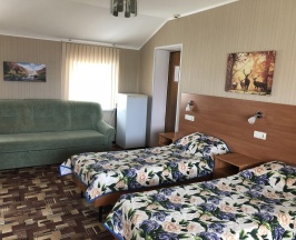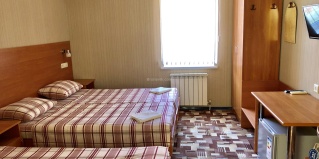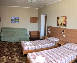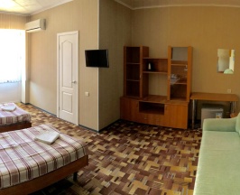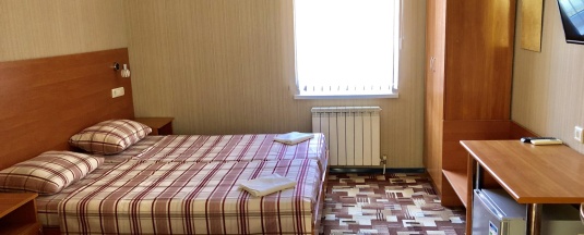 Возможность двух и трехместного размещения. Двуспальная кровать и кресло-кровать. Холодильник, ТВ, кондиционер. Ванная комната в номере.