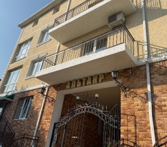 Наш номер оказался наверное лучшим :) просторный, душ, туалет в номере, кондиционер, холодильник, стол, стулья, чайник, тв, шкаф для одежды, две тумбы, два светильника, стенка-шкаф и балкон над центральным входом в гостевой дом. В коридоре есть гладильная доска и утюг. Хорошая звукоизоляция - соседей не слышно. В целом тихое место, спокойное и уютное, вдали от движения транспорта - это плюс для отдыха с детьми. На территории Альтаира своя столовая (у нас были включены завтраки, что тоже очень удобно отдыхая с детьми), приветливые 2 повара, все успевают! Еда как дома. Предлагается небольшой выбор блюд из меню. Есть свой внутренний дворик и кушать можно под открытым небом и дети рядом играли, гуляли, удобно. До моря пешком минут 15-20, по дороге рыночки с фруктами и вкусняшками, сувениркой и разными вещицами. Вокруг много кафе и столовых. Мы довольны и полны впечатлений! Спасибо всему персоналу! :) Большой привет из Красноярска!