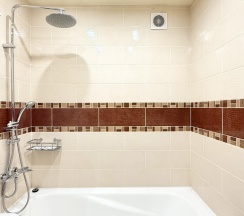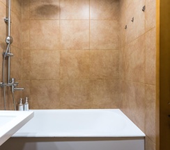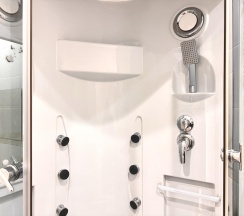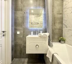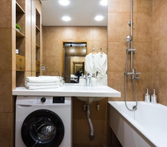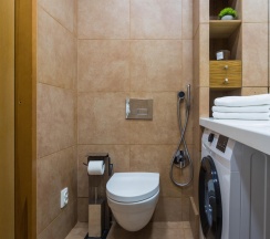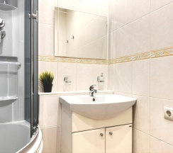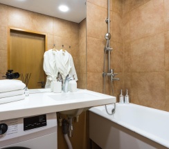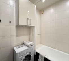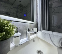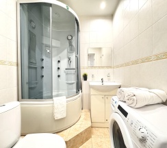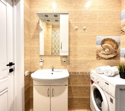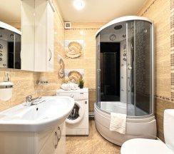 Санузел оснащен современной сантехникой, душевой кабиной и стиральной машиной. Ванная комната отделана керамической плиткой, а зеркала с подсветкой добавляют пространства и света.