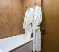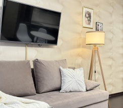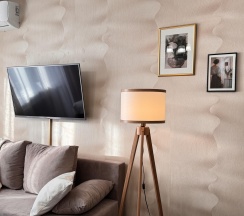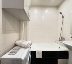 В апартаментах возможно размещение 4 человек. Спальные места: двуспальная кровать, раскладной диван. Кухня оборудована необходимой посудой и техникой: холодильник, варочная поверхность, микроволновая печь, электрический чайник. К услугам гостей также телевизор, wi-fi, стиральная машина, постельное белье, полотенца, утюг, фен.