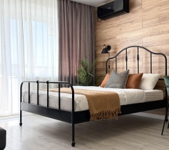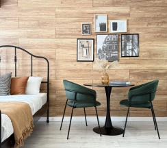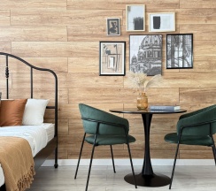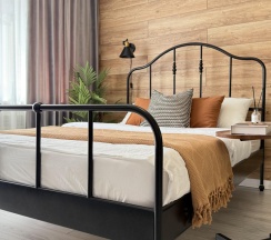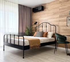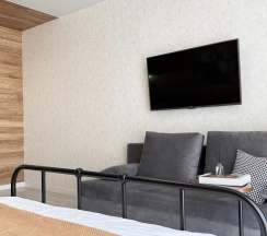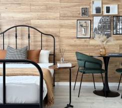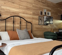 Стены украшены стильной деревянной вагонкой, которая добавляет интерьеру теплоты и природной эстетики. В комнате установлена удобная двуспальная кровать с ортопедическим матрасом, что обеспечит вам комфортный сон. Также имеется диванчик, который может служить дополнительным местом для отдыха или гостевым спальным местом.