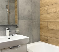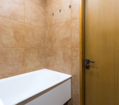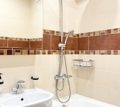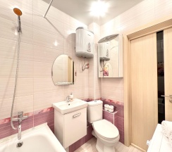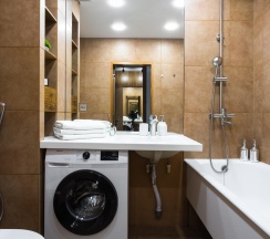 Кухня оборудована всем необходимым для приготовления пищи: современной техникой, столешницей и обеденным столом с табуретами. Санузел совмещённый, отделан плиткой, что придаёт ему аккуратный и современный вид.