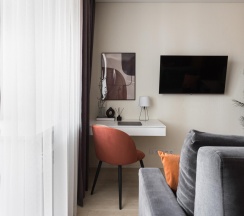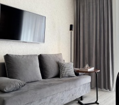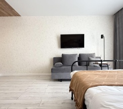 Жилая зона включает в себя удобный диван-кровать, который легко трансформируется в двуспальное место. Двухспальная кровать. Телевизор с плоским экраном и доступ к интернету позволят вам расслабиться после насыщенного дня. В квартире также есть рабочий стол, где можно поработать или просто посидеть с ноутбуком.