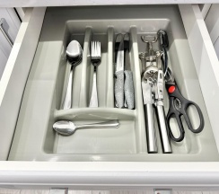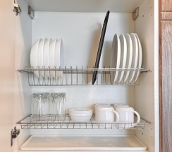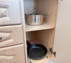 - Кухня: Полностью оборудованная кухня с плитой, холодильником, микроволновой печью, посудомоечной машиной, набором посуды и кухонных принадлежностей.