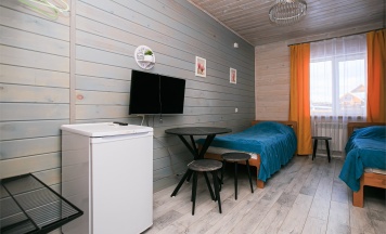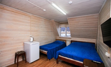 В номере две односпальные кровати, санузел c душем, холодильник, телевизон