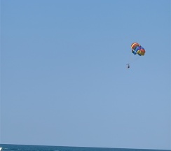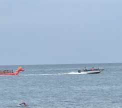 ПЛЯЖ. Круглый камень средним размером с плоский персик. Выход из воды так себе. Катамаран в августе 2020 года 500 руб/час, банан 300 руб/чел, тир 200 руб. Перед входом постараются сделать массаж какой-то штукой с вертящимися шариками. Есть рынок с пляжным инвентарём.