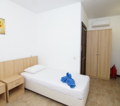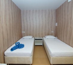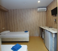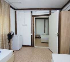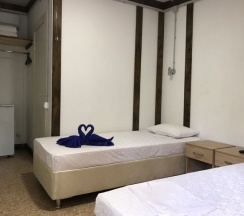 Номер расположен на третьем этаже корпуса №1, площадью 20 кв.м. В распоряжении гостей собственная ванная комната с душем и санузлом. В числе удобств - 2 кровати с комфортными матрасами (при необходимости кровати можно объединить или установить раздельно), одна металлическая двухъярусная кровать, шкаф, прикроватные тумбочки, холодильник, сплит-система. Гостям предоставляется постельное белье и полотенца.