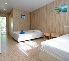 Номер расположен на втором этаже корпуса №1, площадью 20 кв.м. и имеют собственный выход из номера на большой балкон , номер оснащены садовой мебелью. В распоряжении гостей собственная ванная комната с душем и санузлом. В числе удобств - 2 кровати с комфортными матрасами (При необходимости кровати можно объединить или установить раздельно), одна металлическая двухъярусная кровать, платяной шкаф, прикроватные тумбочки, холодильник, сплит-система, телевизор с плоским экраном. Гостям предоставляется постельное белье и полотенца.