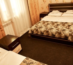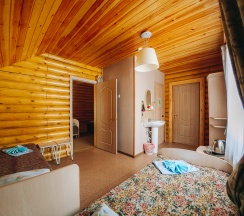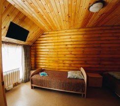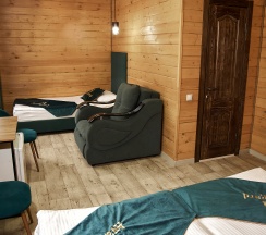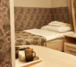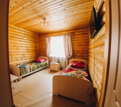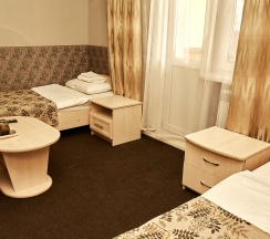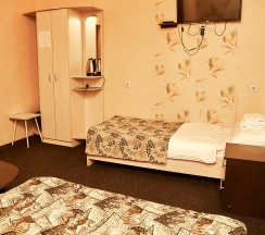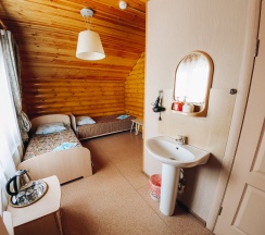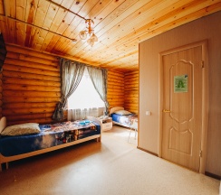 1 этаж. Однокомнатные номера. В номере три односпальные кровати-боксы (сдвигаются), 2 тумбочки, жур. столик, прихожая. В ванной комнате - душевая, банные принадлежности (мыло, шампунь, гель для душа).
