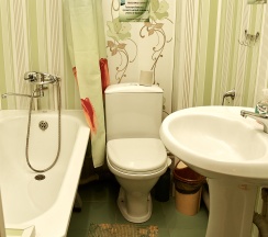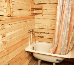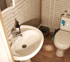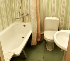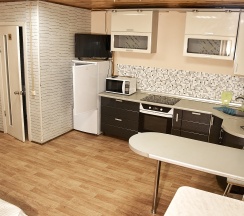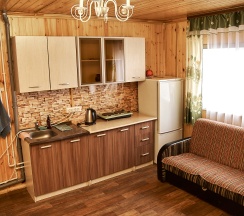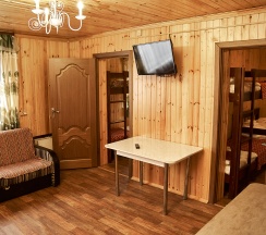 1 этаж. Однокомнатные номера площадью 18 м2. В номере три односпальные кровати-боксы (сдвигаются), 2 тумбочки, жур. столик, прихожая. В ванной комнате - душевая, банные принадлежности (мыло, шампунь, гель для душа, гарнитур, обеденный стол, 6 стульев, холодильник, микроволновая печь, эл. плита, чайник, посуда из расчета на 6 персон, кухонные принадлежности.