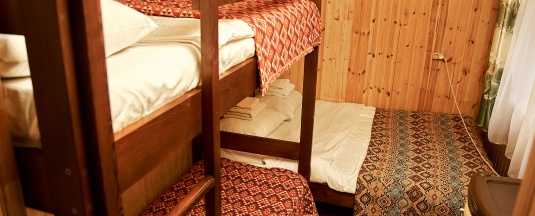 2-х спальная кровать, 2-х ярусная кровать, тумбочка. сан.узел расположен в рядом стоящем здании.