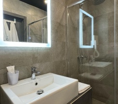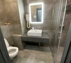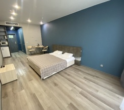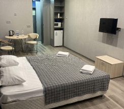 3 дня проживали в 604 номере. Из плюсов: просторный номер, 2 комнаты и гостиная. В номере одноразовые тапочки, зубные щетки, шампунь, гель, мыло, полотенце для тела, для рук. Набор посуды, холодильник, микроволновка, варочная панель и духовой шкаф. Отель расположен не далеко от набережной и центра. В здании на втором этаже хорошее кафе, на 3 ресторан. Есть парковка. При заезде стояло 4 бутылочки с водой. Из минусов: номер уже требует определённого ремонта. В микроволновке тарелка крутится через раз, из-за чего еда не равномерно прогревается. На телевизоре зачем-то стоит родительский контроль, при включении надо подтвердить что тебе есть 18. Нажимаешь да, но порой он не прогружается и дальше изображение есть, звука нет. Приходится все выключать и включать заново. Рядом очень шумная дорога, окно не откроешь. Окно можно открыть только в гостиной, в спальнях на окнах замки. Самый главный минус - двухспальная кровать сделана из 2 односпальных и сверху на односпальные матрасы положен тоненький двухспальный. Проснулась после первой ночи шея и спина болят, под головой проваленный матрас. Поправила матрас - лёг ровно, вторая ночь такая же ситуация, думаю что за фигня, приподнимаю матрас, а там под головой не хватает доски в каркасе кровати. Горничная явно вкурсе, не возможно менять постельное чтобы этого не заметить.