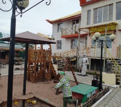Местоположение хорошее, во дворе небольшая детская площадка, несколько мангальных зон, бассейн неплохой, на этом плюсы заканчиваются