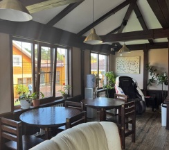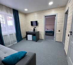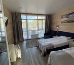 Отдыхали 5 дней в номере Джуниор. Двухкомнатный номер со всеми удобствами. Очень чисто, новая мебель, хороший напор воды. Диван удобный, полноценное двуспальное место. Взяли трёхразовое питание — не пожалели, свою еду всю обратно отвезли, не понадобилась. В каждом домике есть детская игровая. На территории бассейн, баня, сауна — всё новое. Оборудованный пляж в 5 минутах ходьбы (дорожка, скамейки, раздевалки). Чуть дальше есть детский развлекательный парк. Цены ниже, чем у конкурентов. Отлично отдохнули, спасибо хозяевам!