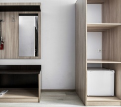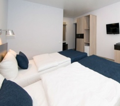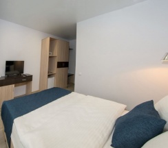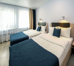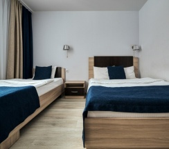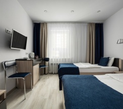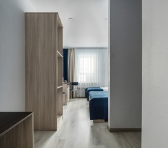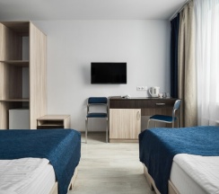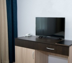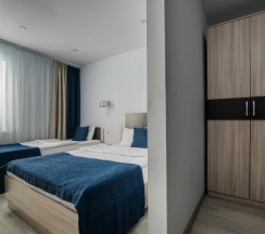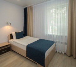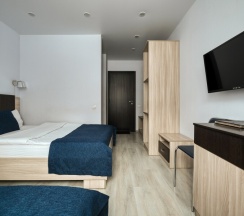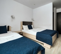 Семейный номер, площадью 20 м. кв., в номере 1 односпальная кровать (90 см) и одна двуспальная кровать (140 см). Номер оснащен всем необходимым для комфортного проживания. К вашим услугам: бесплатный wi-fi, телевизор с плоским экраном, телефон, мини-холодильник, электрочайник и чайный набор. В ванной комнате для вас набор белоснежных полотенец, набор средств индивидуальной гигиены, фен, тапочки.
